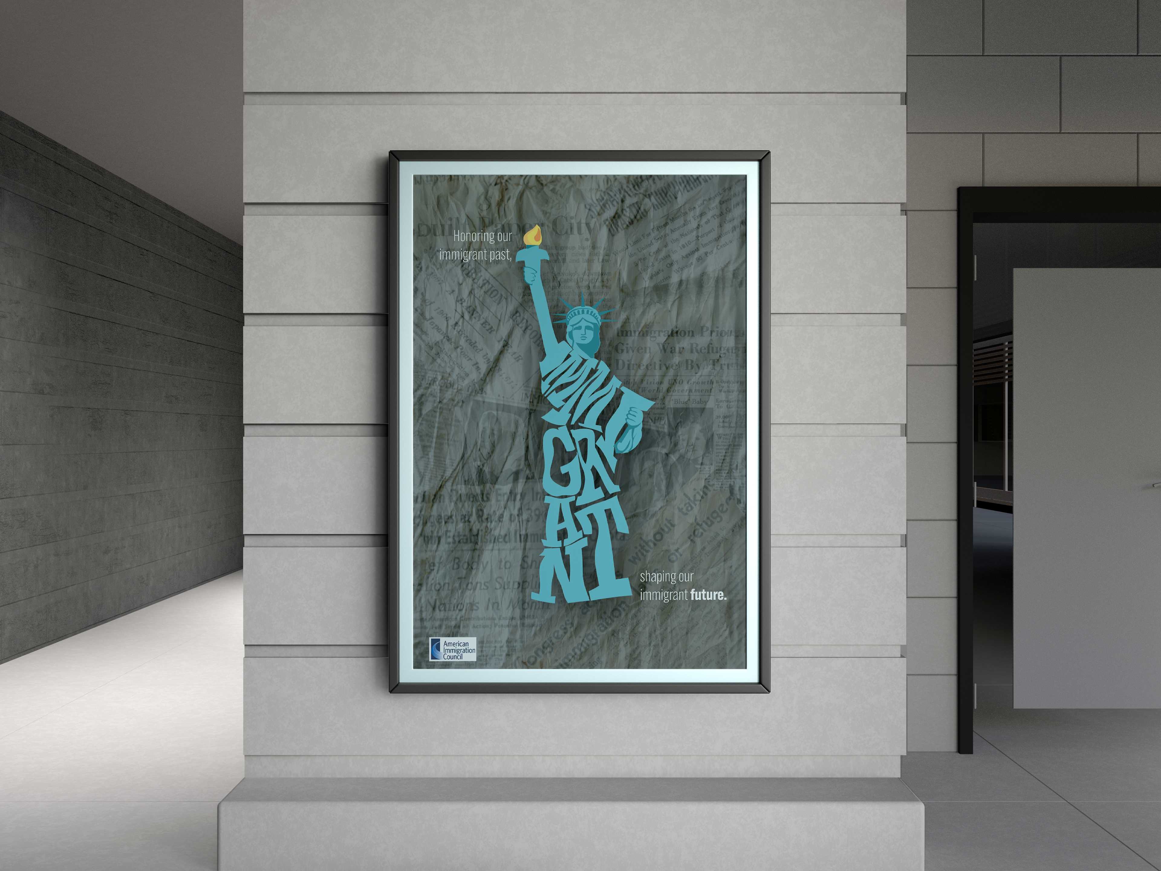 This campaign poster serves to promote awareness about the American Immigration Council. The word “IMMIGRANT” is shaped to form the statue of liberty as the focal point of this piece. This symbolic choice reminds the public that America is a melting pot of many diverse backgrounds and adds to the narrative of inclusivity and acceptance of all.